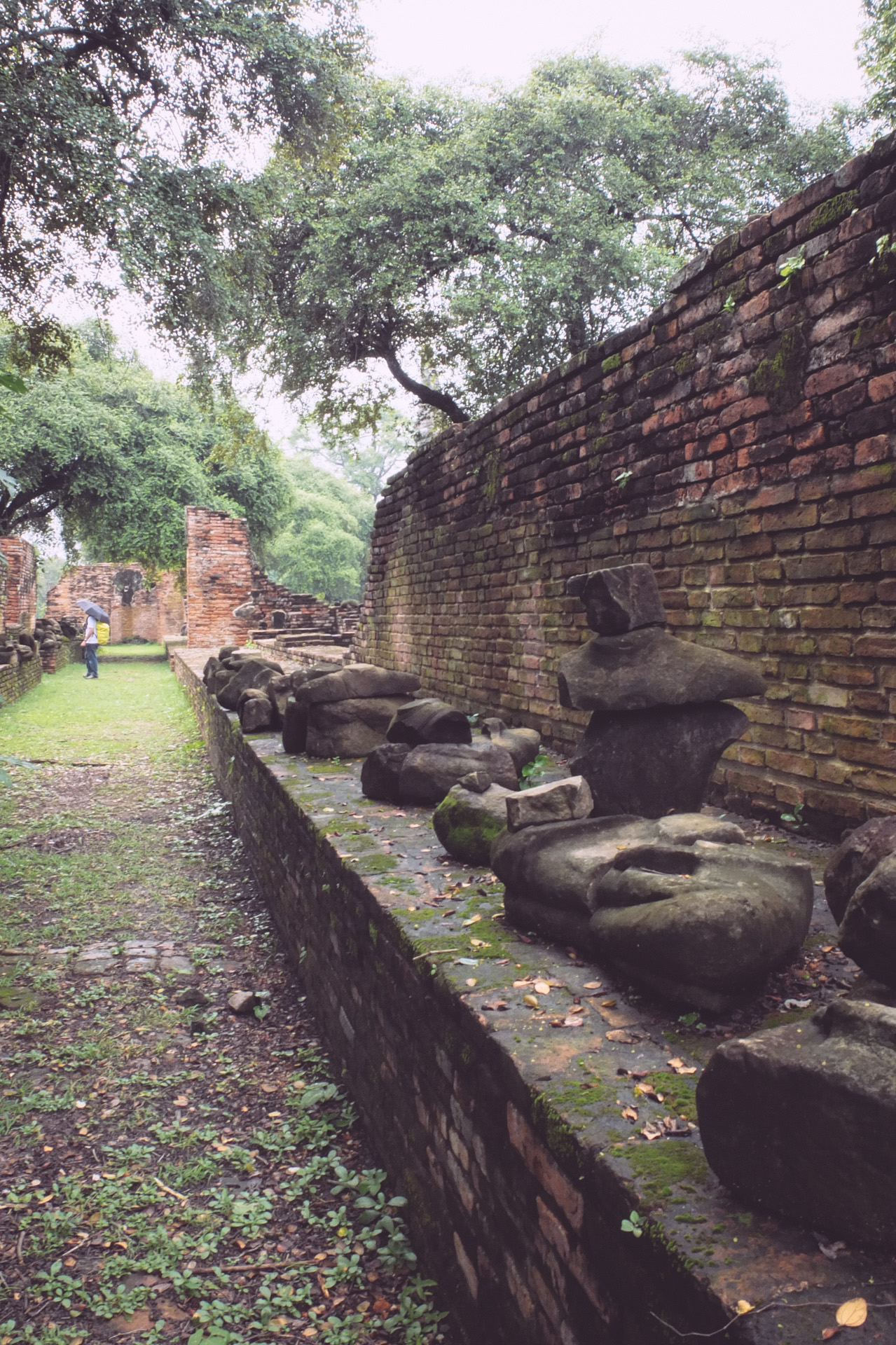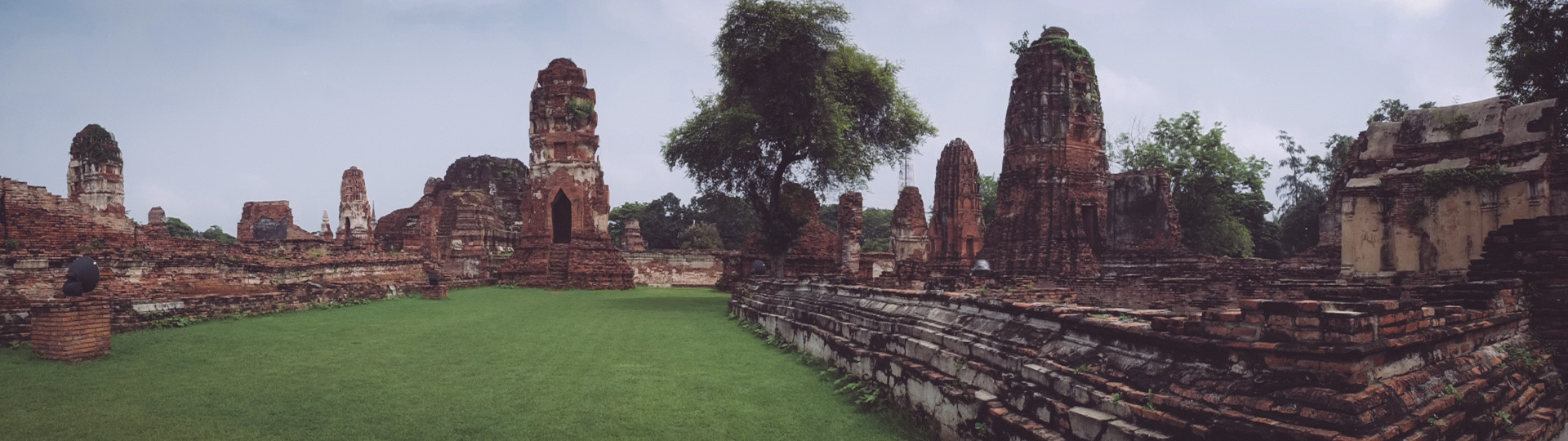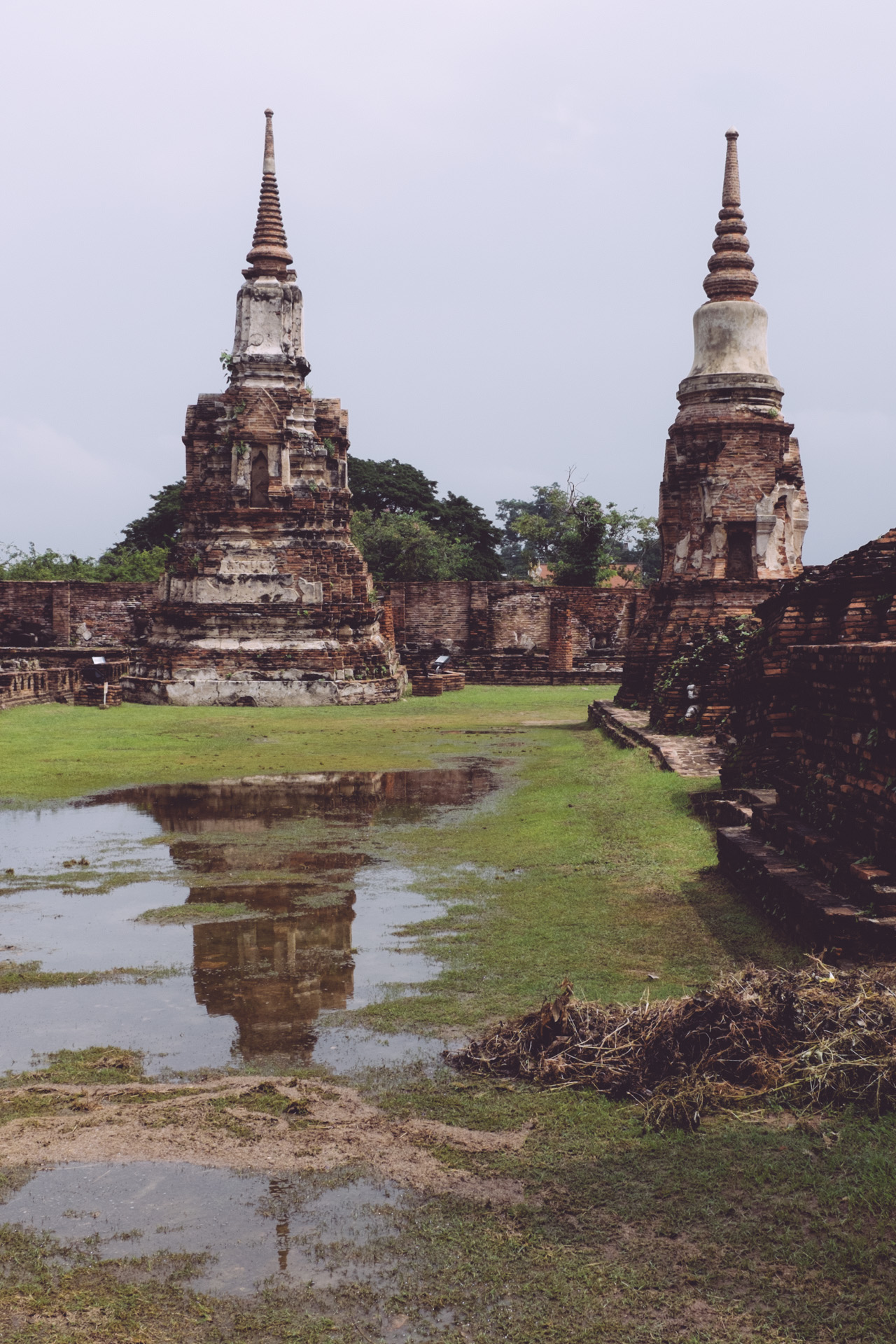 Dernière escapade thaïlandaise avant de rentrer à Paris. Nous bravons courageusement la pluie -et mon entorse- pour s’octroyer un voyage historique ; une visite de la ville d’Ayutthaya, ancienne capitale du royaume du Siam. Nous renouons ainsi avec la visite de temples en ruines et de sites inscrits au patrimoine mondial de l’UNESCO après notre découverte d’Angkor en début d’année.