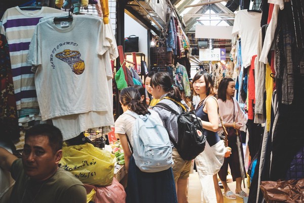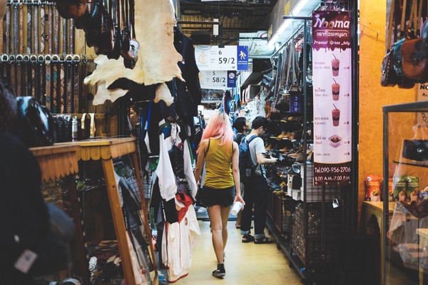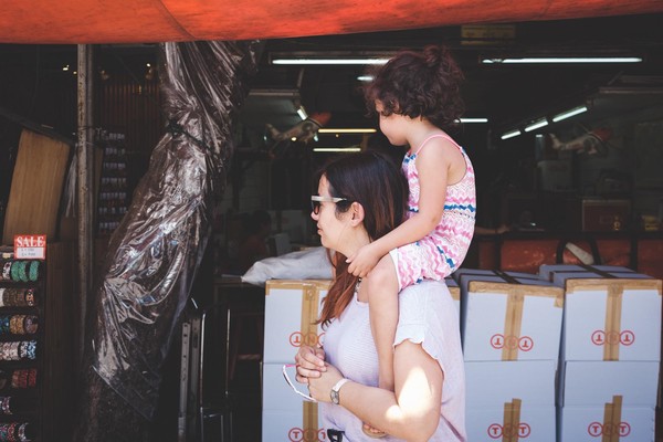 Après un levé et déjeuner tardif, direction Chatuchak : the place to be le week end, enfin à ce qu’il parait aussi. Selon la légende tout Bangkok se retrouve là bas en fin de semaine, histoire de se perdre dans les millions de stands de ce marché qui croise gentiment les puces de Clignancourt et les souks de Marrakech. Comme il se doit, il y fait une chaleur à creuver et ce n’est pas le parc d’à coté qui nous offrira un quelconque répit. Si je commence méchamment à sentir le fennec, guettant les regards accusateurs autour de moi ; la petite, elle, tient bon et en redemande. Elle concocte une potion magique pour que son sac à dos magique lui aussi puisse accueillir colliers, bijoux, robes, pierres précieuses, bref tout ce qu’elle trouve dans ce marché géant.