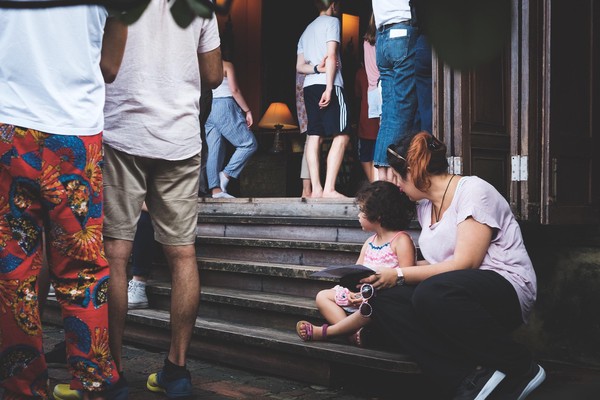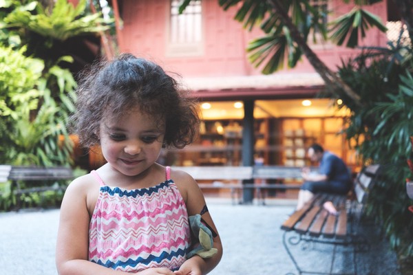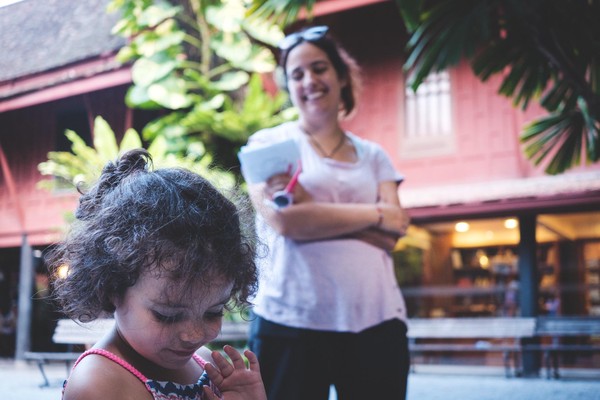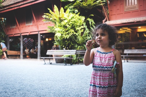 Fast forward en BTS (le métro pas le backstage), et nous voila dans la maison non pas de Jim Morrison mais de Jim Thompson. On ne peut la visiter qu’en groupe, et que avec des guides … autant dire que notre baromètre à fuite commencer à virer sur « ouh-là ». La visite démarre, il faut laisser les sacs dans des casiers, le baromètre est sur « ouh-là-là on s’casse » mais mademoiselle a envie de voir … on y va. L’histoire on la connait, la guide parle en anglais et on se dit que notre demie portion va changer d’avis : nope nope nope. Mademoiselle voudrait bien voir la suite, même quand il faut continuer la visite en chaussettes et que notre barofuite rouge cramoisi nous hurle de courir. Mais non même la visite terminée, la micro puce voudrait visiter le jardin …