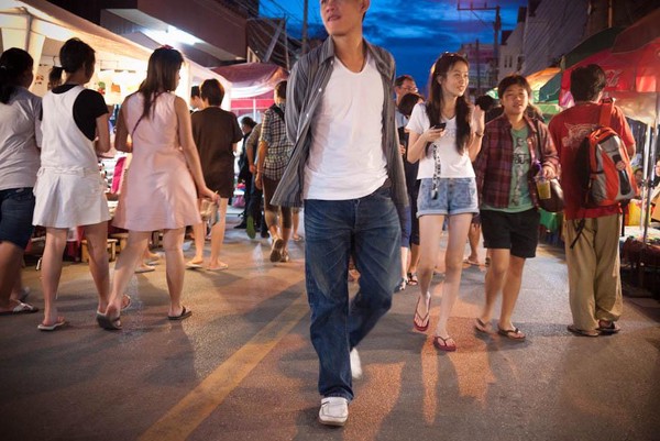 Direction donc le Saturday Night Market, où nous retrouvons toute la population de Chiang Mai. Ca y’est on a retrouvé les jeunes, sortis des écoles, et la foule se déverse dans les ruelles du marché. Appareil photo en mode intelligent (parfois ca sert), à hauteur de ventre pour faire ressortir l’éxubérante population et clac clac ça mitraille, on verra ce qu’il en ressort. Le GF1 se comporte bien, quelques hasards heureux, avant de finir autour d’un menu de spécialités Thai dans un resto qui tient plus de la brocante que de la gargotte.