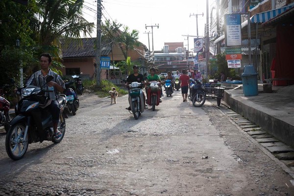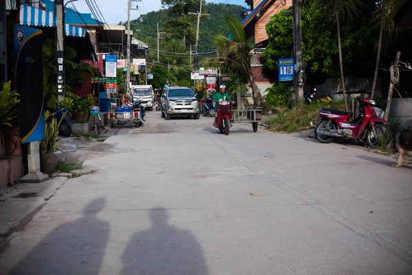 Le trajet entre Koh Samui et Koh Tao dure deux heures, avec un arrêt rapide à Koh Pha-ngan, qui ceci dit nous a semblé déjà un peu plus répondre un peu plus à nos attentes. L’arrivée sur Koh Tao nous confirme l’intérêt d’aller se perdre sur cette petite île. Pour le premier soir, nous restons dans le centre névralgique qui est aussi la plage principale. Il est clair que l’activité touristique est importante, tous les panneaux sont en anglais, les magasins alternent entre laverie, restaurant, agence de voyages et bien sûr club de plongée. Mais on trouve aussi des échoppes de légumes, de poissons, de glaçons ou de matériaux de construction. Cela donne un joyeux mélange et une activité importante. Il est terriblement difficile de rendre cette atmosphère particulière de fin d’après-midi, difficilement saisissable.