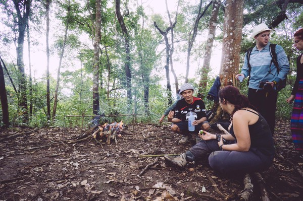 Chiang Mai, la perle du Nord. La différence est saisissante avec Bangkok, le rythme même de la ville est différent, un peu plus lent. Les habitants sont aussi plus détendus, laisse les choses venir (non je n’ai pas voulu dire nonchalants). Après une petite balade en ville nous décidons de retourner voir notre très cher agence proposant des treks à la journée, qui justement en proposait un le lendemain et suite à une forte pression gerbillesque, je l’avoue, nous réservons le trek. Il s’agit toujours de Pooh Eco-trekking, une agence de trek proposant à chacun de ses treks une visite dans une communauté des tribus des montagnes. Ils sont forts bien organisés, très sympathiques et leurs treks permettent toujours de voir une nouvelle facette de la région et de la vie à la frontière birmane. Ce trek a été l’occasion de goûter un repas réalisé à 90% à l’aide d’ingrédient trouvés le matin même dans la forêt par notre guide et ses deux cousins qui nous accompagnaient. Nous avons mangé de la viande (ou tofu pour la végétarienne du groupe) aux petits légumes cuit dans une feuille de bananier au feux de bois. D’aucun ont également gouter l’araignée de bananier grillée également au feu de bois.