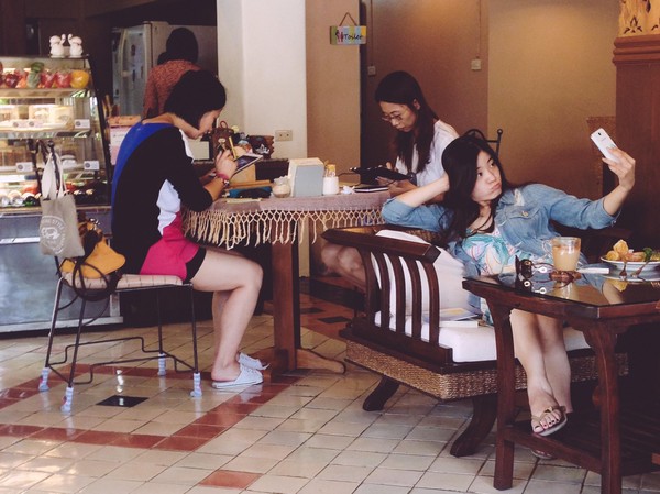 Dernier jour dans l’ancienne capitale du royaume de Lanna, avec une Gerbille toujours confinée au repos forcée. Il y a de nets progrès, mais il vaut mieux sacrifier quelques jours de vacances pour accélérer la guérison. La miss s’octroiera tout de même quelques sorties pour les repas, l’occasion de ramener une photo volée de ces touristes chinois qui passent leur temps collés à leur téléphone ou tablette (sans déconner, c’est assez affolant!).