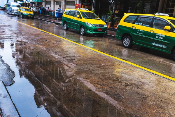 Paradoxalement, les jours de pluies sont plein de couleurs, là où on les imaginerait plus gris que les autres. L’eau sur les trottoirs donne un brillant particulier à la ville et dès que la pluie cesse les flaques sont autant de miroirs où la ville s’exprime à l’envers. La chasse aux reflets peut commencer et nous reparcourons des routes tant connues sous un nouvel angle. Si nous donnons l’impression de nous balader en regardant nos pieds, c’est pour mieux traquer les hauteurs dans les flaques d’eau, débusquer les couleurs dans les roues d’un taxi où les modèles d’un jour dans les parapluies.