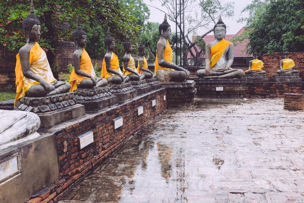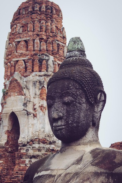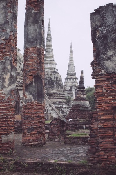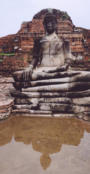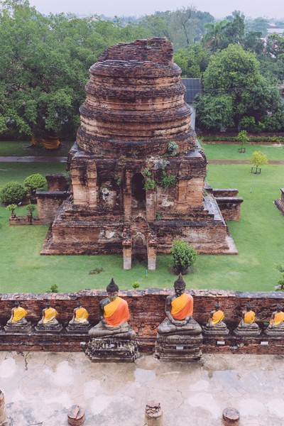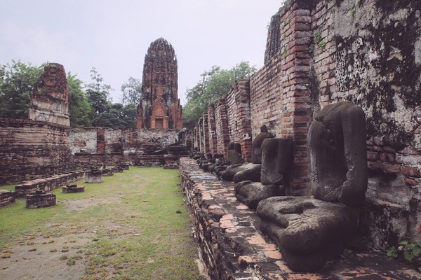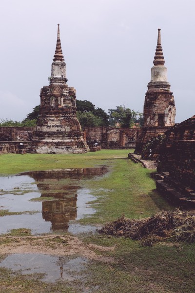 Dernière escapade thaïlandaise avant de rentrer à Paris. Nous bravons courageusement la pluie -et mon entorse- pour s’octroyer un voyage historique ; une visite de la ville d’Ayutthaya, ancienne capitale du royaume du Siam. Nous renouons ainsi avec la visite de temples en ruines et de sites inscrits au patrimoine mondial de l’UNESCO après notre découverte d’Angkor en début d’année.