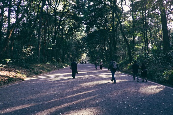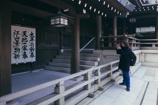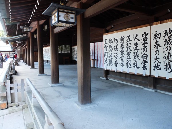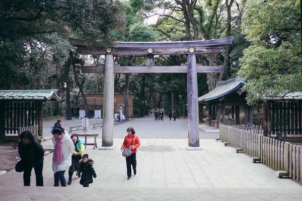 Après quelques déboires (ange: comprendre se faire renverser le thé bouillant sur le bras par sa fille ^^), nous voici repartis sur la route de notre premier temple shintoïste. Le lieu est à la fois bondé de personnes, aussi bien touristes que de locaux venus se recueillir mais l’ambiance est fort sereine. Seuls les coups de gongs et l’agitation d’un garde assurant le bon dépôt des offrandes sonnantes et trébuchantes rythment l’endroit.