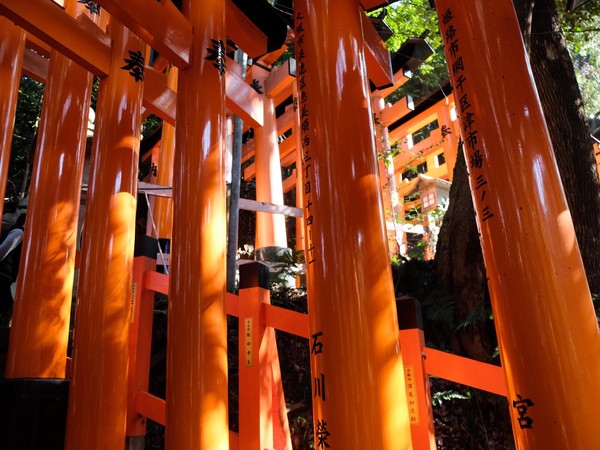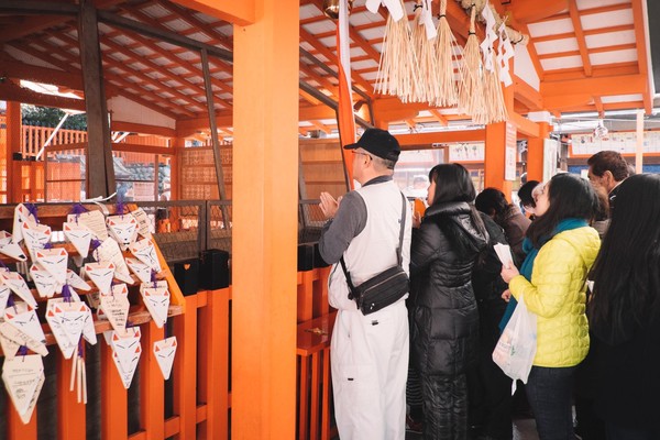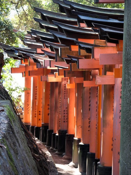 L’accès aux autres temples du site s’est fait au milieu de la même foule joyeuse, prenant des photos et rigolant. Comme souvent, nous nous sommes vite échappé via un chemin de traverse jusqu’au sommet du mont Inari à travers petite forêt mixte de pins et de bambous. L’ascension fut quelque peu éprouvante (ange: la fille sur le dos T_T) mais nous avons pu goûter à la spiritualité du lieu en toute quiétude avant de retrouver le chemin plus traditionnel (ponctués d’autels, de vendeurs d’offrandes, de café et de glaces) lors de la descente.