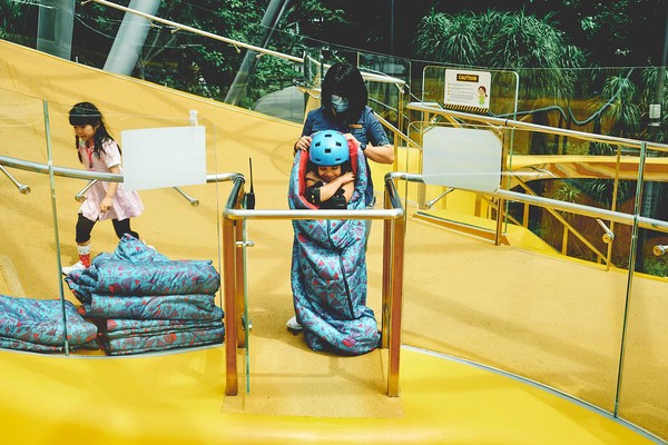 Au dernier étage se niche une espèce de parc - payant - , avec des attractions - payantes - et des restos - gratuits … non payants évidemment #tavulavierge -. Vérification de la température corporelle à chaque entrée, désinfection permanente, peu de monde … les conditions sont les meilleures possibles pour se tenir loin du virus.. Alors on en profite un peu, on touche à rien, on s’émerveille devant la puissance commerciale singapourienne, et on passe le temps. D’ailleurs quand j’y pense, je ne sais pas comment on a réussi à faire que mini nous ne touche à rien pendant autant de temps et malgré tout s’amuse : la princesse est vraiment exceptionnelle.