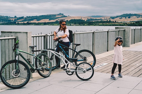 Le vélo c’est un truc qui nous plait dès qu’on sort de Paris. On avait déjà tenté les tours de lacs au Canada, en tirant Mininou en carriole, les tours de ville de Malaga et de Valence en Espagne avec la petite dans un siège derrière moi. Donc pour ce voyage, Mininou sachant faire du vélo, nous voulions tenter le tag along qui permet de transformer tout vélo adulte qui se respecte en tandem en attachant le vélo de l’enfant derrière. Le premier essai pour un tour en forêt / montagne n’était pas vraiment concluant et on se ravise en se disant qu’il faudrait éviter que le père et la famille ne finissent les vacances avec une commotion cérébrale. On se rabat donc sur le tour du lac.. enfin un bout car le lac il est trrrrrrrrès grand. Nous voilà donc partis le long du lac Taupo, très frais sauf quand il est réchauffé par l’activité géothermique. Ange pilote le tandem du mieux possible, Mininou pédale en regardant les petits canards et moi je profite du moment. Je découvre ainsi une activité incroyable de golf 1 trou avec practice sur la plage et envoi de la balle sur une bouée gonflable sur la mer… ou encore la location de bateaux en forme de donuts. Ainsi j’ai eu l’idée de créer moi aussi une nouvelle activité sportive : le lancer de gerbille sur bitume. #gerbillevolante #vilainvelo. Heureusement que nous ne sommes pas allés en forêt, j’aurais pu manger de la terre… beurk.