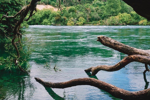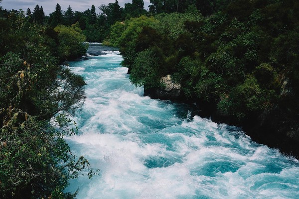 Augmentant ainsi notre rayon d’action, nous n’y tenons plus et repartons pour le sud. Au programme un nouveau site géothermique… ah non la famille a mis son veto à force de dormir à Rotorua dans l’odeur omniprésente de souffre. Donc plan B, nous nous arrêtons aux Huka Falls. Les pieds nous démangent, nous voulons remonter la rivière pour une balade de quelques km mais non ce ne sera pas possible. Le ventre crie famine. Nous trempons juste les mains dans l’eau bleu glacée et on repart pour Taupo pour trouver des vélos.