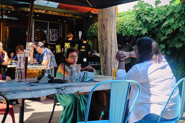 Après cette matinée bien occupée, on se trouvera un petit spot pour déjeuner : on le pensait blindé et inaccessible jusqu’à ce qu’on se rappelle qu’on n’est pas à Paris XI ici m’sieur … c’est grand, en extérieur, sans prise de tête : des tables en bois sous parasols partout, des enfants joyeux qui côtoient bikers, randonneurs et familles en goguette. Et même qu’on y mange bien en plus …