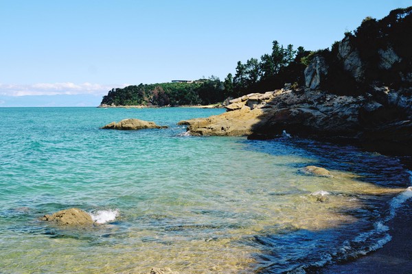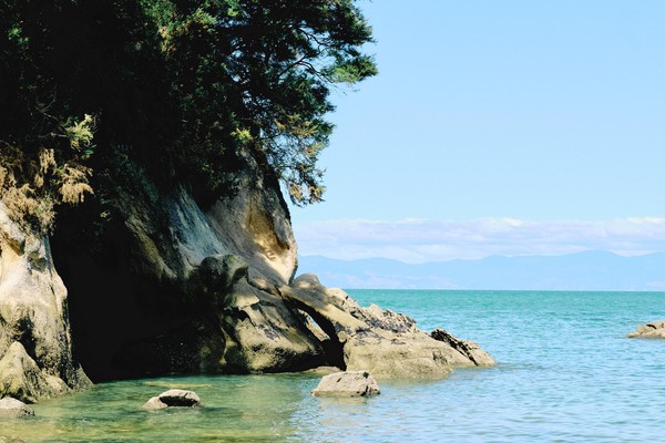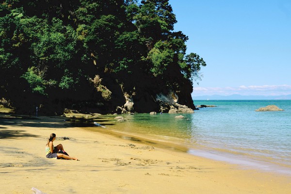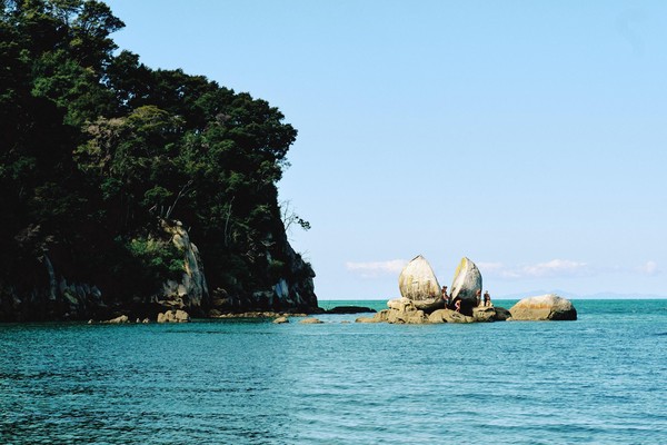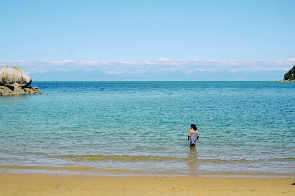 Puisqu’il en faut pour tout le monde et que Mininou est plus étoile de mer que rando en forêt, direction la plage du Split Apple Rock. Pas trop d’imagination à avoir, il s’agit bien d’une plage avec un gros caillou fendu rappelant une pomme coupée en deux. Ni plus ni moins. Enfin ni moins … voilà quand même la plage genre paradis avec eau transparente - qui colle pas dixit la Gerbille - et sable fin qui colle pas non plus sauf aux fesses de Mininou.