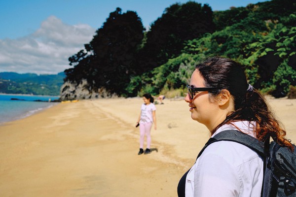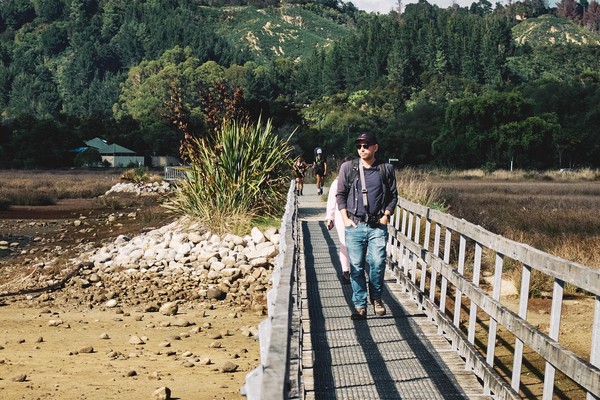 Donc ce matin, nous voila partis sur le sentier du Parc Abel Tasman, une des 11 “grandes promenades officielles” de Nouvelle-Zélande, autrement dit ZE place to be. OK le sentier fait 60 km du Sud au Nord… on en a fait que 4 (sans compter le retour) mais c’est déjà très bien pour une randonnée photo à 3.