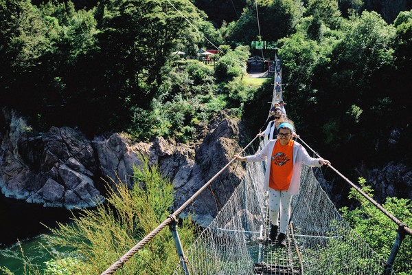Pour nous permettre de conserver toutes nos capacités intellectuelles après une telle contemplation végétale, nous nous arrêtons pour passer sur le plus long pont suspendu de NZ, 110 mètres de long au dessus de 19m de vide. Tout se passait très bien avant qu’un groupe décide de ne pas attendre la fin de notre traversée et ainsi de passer dans l’autre sens en même temps que nous. Et là ce n’est pas la longueur du pont le problème… mais bien la largeur de celui-ci. Je n’ai jamais cotoyé d’aussi proche des étrangers avec le choix cornélien de, soit se croiser dos à dos et de regarder dans le vide, soit les croiser de face et se retrouver beaucoup trop proches d’inconnus. Heureusement après ce moment pas forcément agréable, une petite balade le long de la rivière avec thème minier nous a permis de récupérer, avant un retour direct en tyrolienne. Bah oui, nous on avait bien compris que le pont c’était mieux à sens unique.