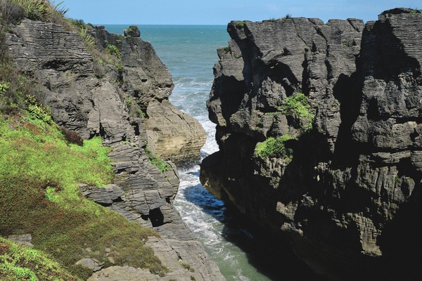 Les Pancake Rocks à Punakaiki portent bien leur nom et sont un site unique au monde et très impressionnants. Le site est accessible à tous, il est clairement identifié et reste une des attractions majeures de la côte Ouest. En revanche, cela est déjà un peu trop touristique pour la famille (même si j’ai adoré faire un peu de shopping au centre local touristique). Ainsi, sans surprise, j’ai eu un plus grand coup de coeur en descendant un petit sentier caché un petit peu plus loin qui nous menait à travers la forêt tropicale, à des étendues à perte de vue de lin (flax) qui est la seule plante à supporter les embruns locaux puis la côte alternant falaises et plages. Personnellement j’ai déjà eu du mal à supporter 3 heures sur place entre le soleil et les embruns.. donc tout mon respect au lin !