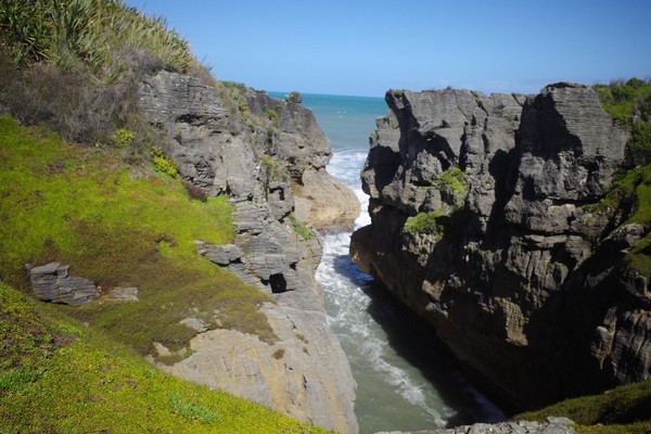Aujourd’hui on va voir les pancake rocks qui sont en fait des rochers géants dans la mer qui se sont formés quand des couches de différents sédiments se sont empilées au fil des années et il y a un petit chemin dans une réserve qui nous montre ça et un bout de forêt. Alors on a décidé de faire de la route, un petit sentier, ça et on mange. La première balade, on va dans la forêt et on va un peu voir la mer où il y a des vagues très impressionnantes. Ensuite la deuxième balade on voit plein de rochers, d’algues, de rivières et d’autre truc à base d’eau. Il y a aussi plein de panneaux mais je n’ai pas le temps de tous les lire ! Donc qu’est-ce que je fais ? Je les prends en panneaux bien sûr ! J’ai pris en panneaux toutes les photos ! Ah non je me suis trompée, j’ai pris en photo les panneaux et pas l’inverse !
