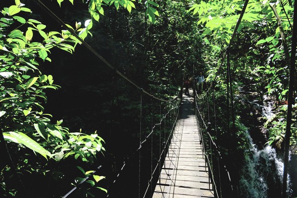 Et grand bien nous y fait parce que la journée s’annonce un peu plus sportive aujourd’hui. Il y a beaucoup de réserves au Costa Rica et beaucoup d’activités à touristes. Pas toujours facile de faire le tri, mais sur ce coup, la Gerbille ne s’est pas plantée dans la sélection. Direction donc vers une initiative locale pour une randonnée sans personne au milieu de la jungle. Dans la famille Forest, je passe Gump et après Cloud et Rain je pioche Tropical et laisse Withacker scier Gerrera. Et là c’est la claque, taille nouvelle Zélande, 46 fillette. Paysages de fous furieux dans une végétation luxuriante à faire houbir un Marsupilami, cascades qu’on dirait Iguazú en petit et ponts de singes à faire pâlir un vertigineux. Un petit trek comme c’est marqué sur la carte postale. Et histoire de le finir en apothéose, on se fait le dénivelé inverse à cheval : Mininou en tête, seule chevauchant Mescal (ça ne s’invente pas) on retourne au son des sabots vers le centre qui nous régalera en plus d’un bon repas. Hormis la gerbille qui se déguise en lapin myxomatosé ; c’est juste parfait.